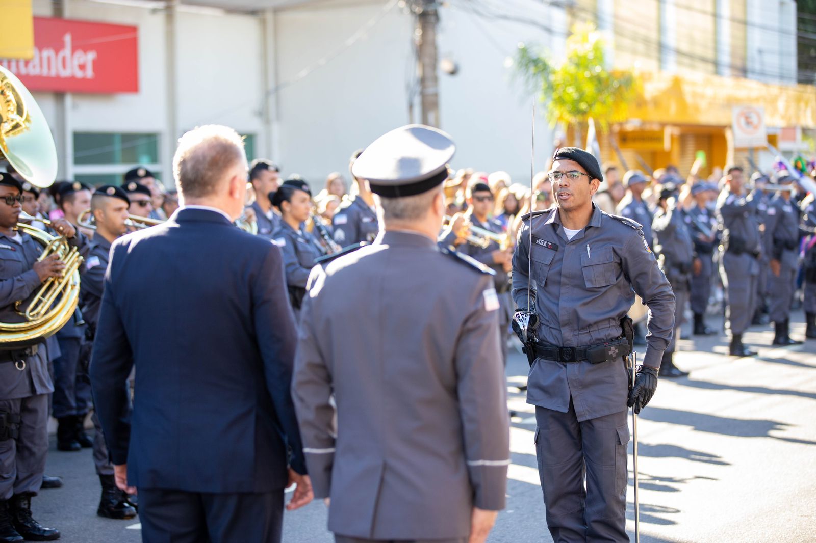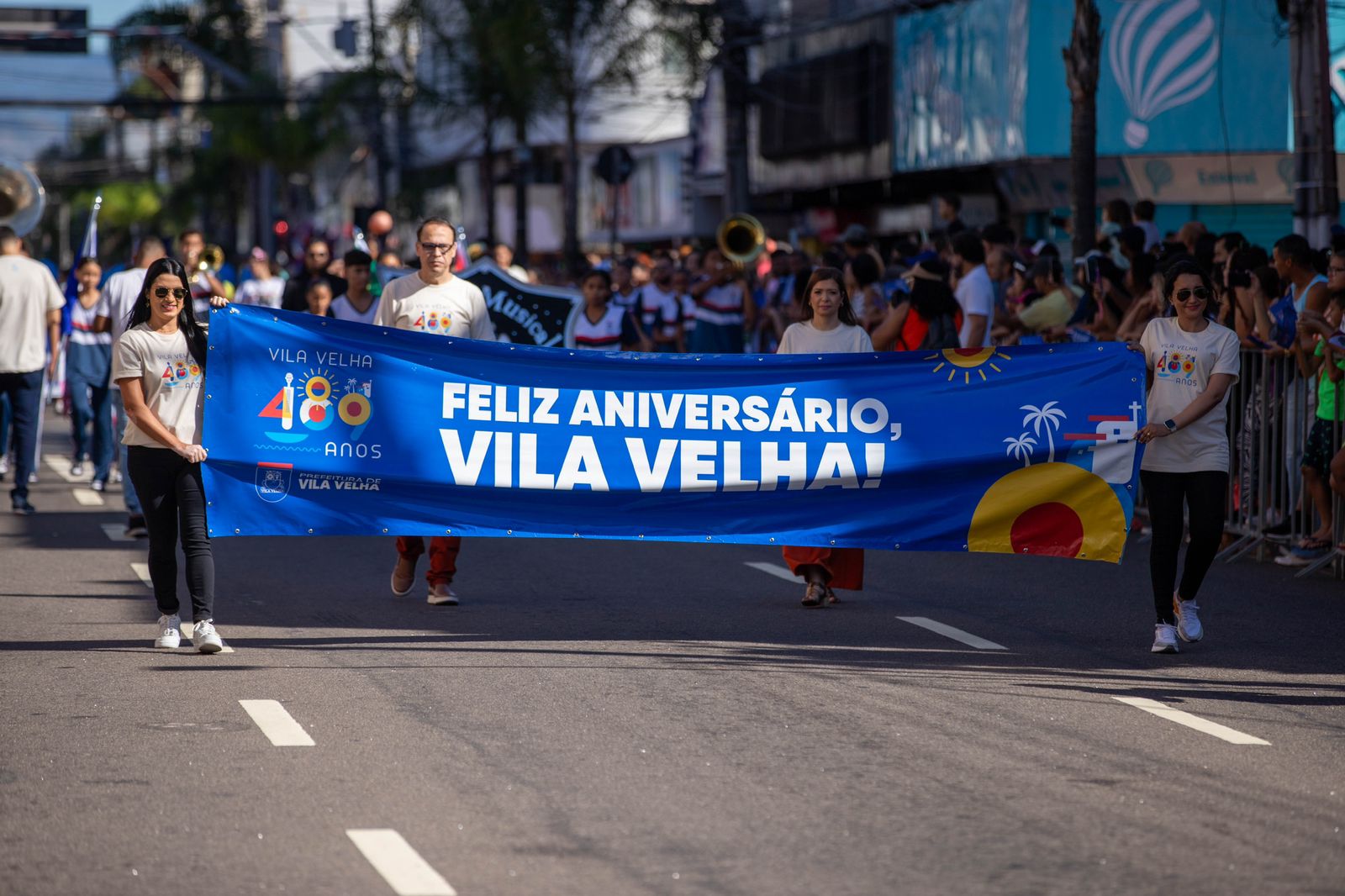 Na manhã desta quinta-feira (23), um belo e animado desfile cívico-militar deu início às comemorações do aniversário de 489 anos da cidade de Vila Velha. Cerca de 10 mil pessoas ocuparam toda a extensão das laterais da Avenida Jerônimo Monteiro, no Centro, para acompanhar a tradicional atração de perto. A população canela-verde manifestou o seu carinho pela cidade e pelas instituições envolvidas, interagindo com aplausos, agitando bandeirinhas distribuídas durante o evento, tirando fotos e filmando todos os detalhes.
