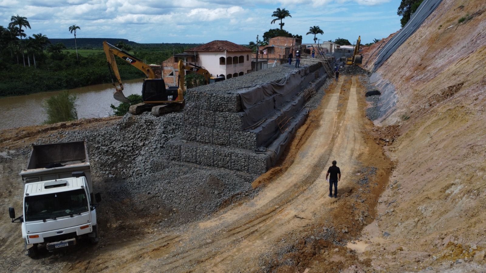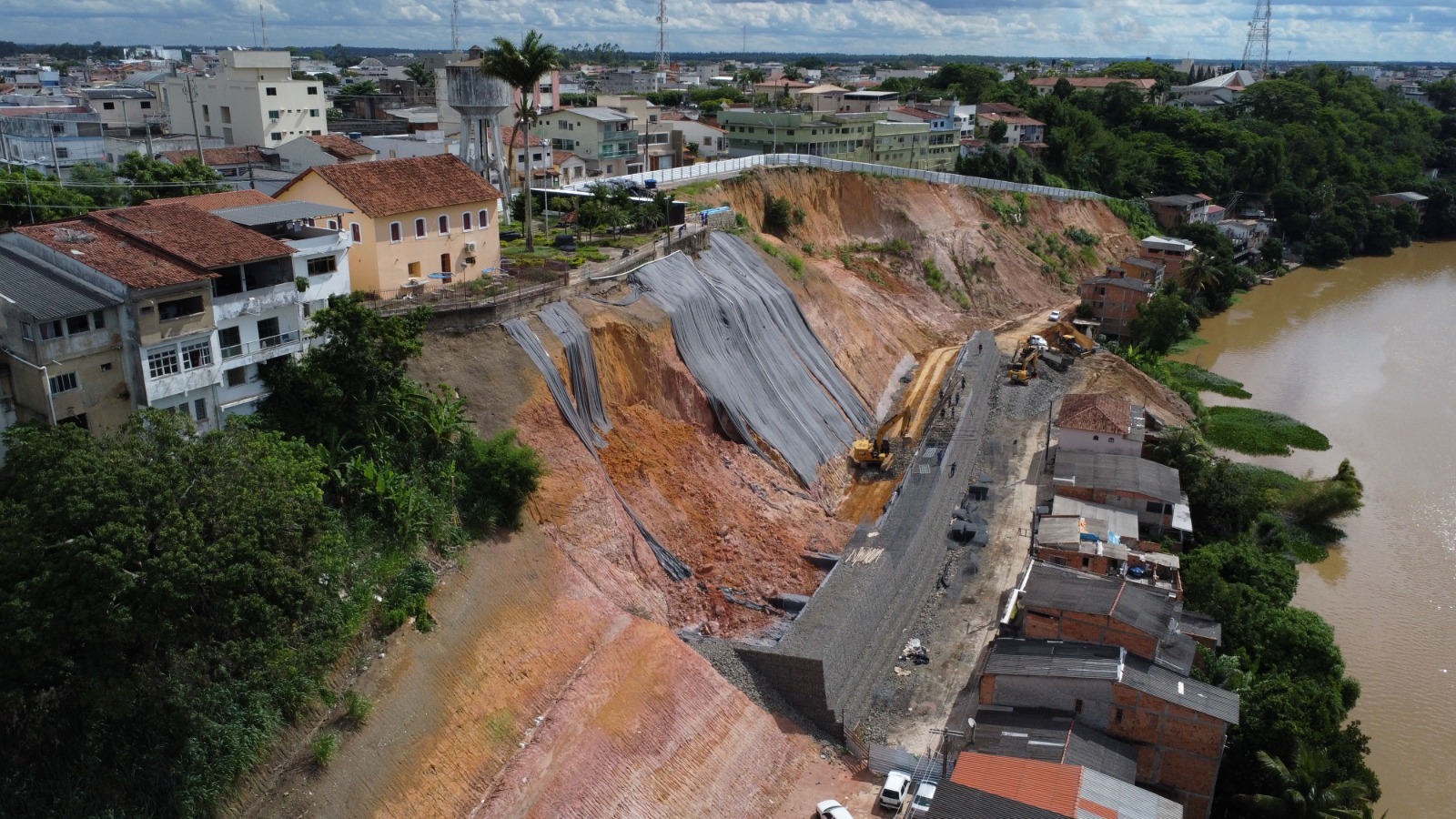 Quem passar pelas imediações do canteiro de obras da Ladeira do Besouro, na parte baixa, não deixará de notar a existência de uma lona gigantesca cobrindo o barranco, próximo ao Museu e à Praça do Mirante: é uma proteção necessária para preservar o corte do terreno em função das chuvas de intensidade variável que têm caído em São Mateus, sem, contudo, impedir o ritmo normal dos trabalhos.