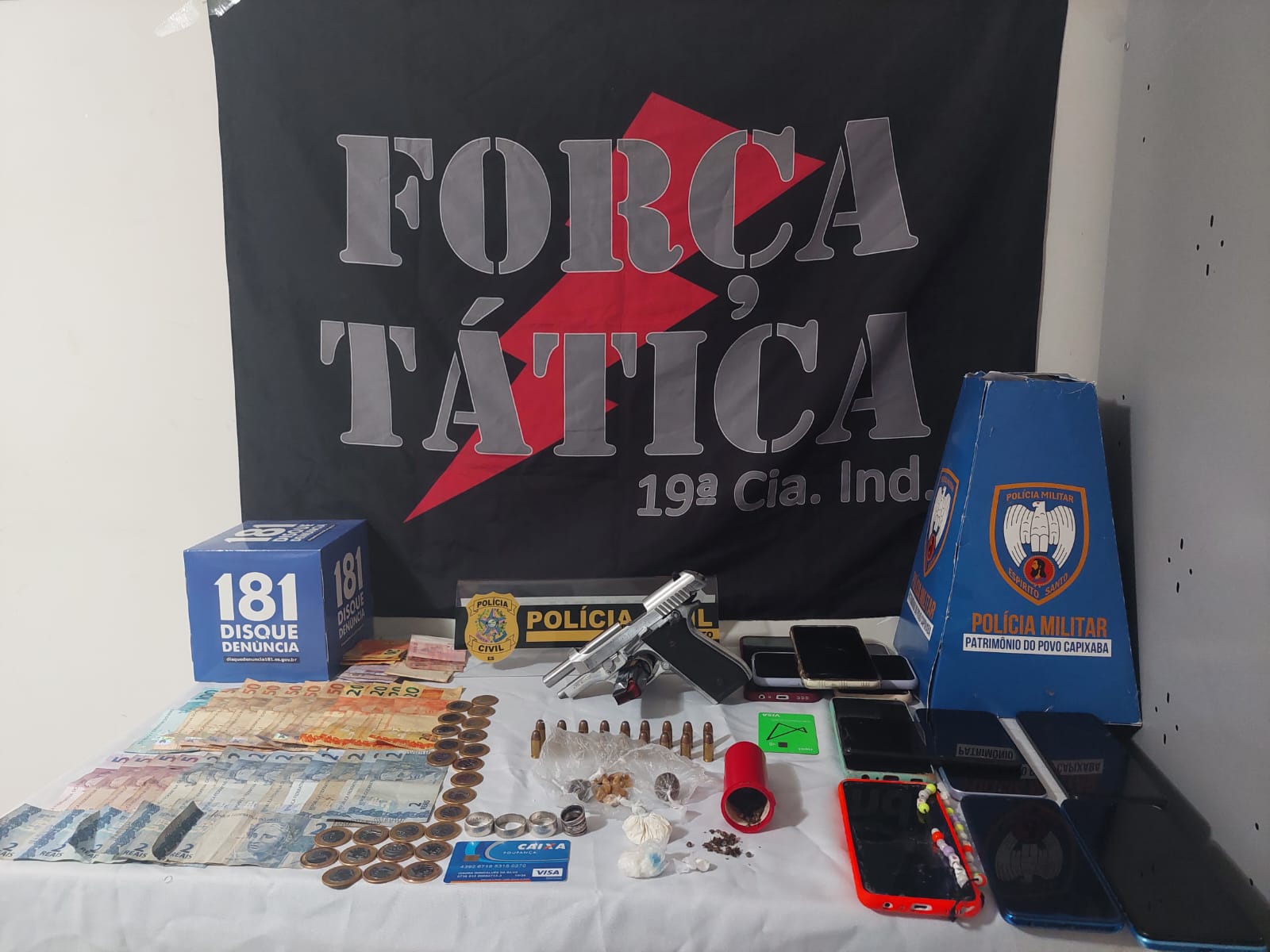 Durante o cumprimento dos mandados de busca e apreensão foram apreendidos: 01 Pistola .380; 18 munições cal. .380; 34 pedras de crack; 02 papelotes de maconha; 03 buchas de maconha; 09 celulares; 01 moto Biz; R$854,00 em espécie; Material para embalo e preparo de entorpecentes.